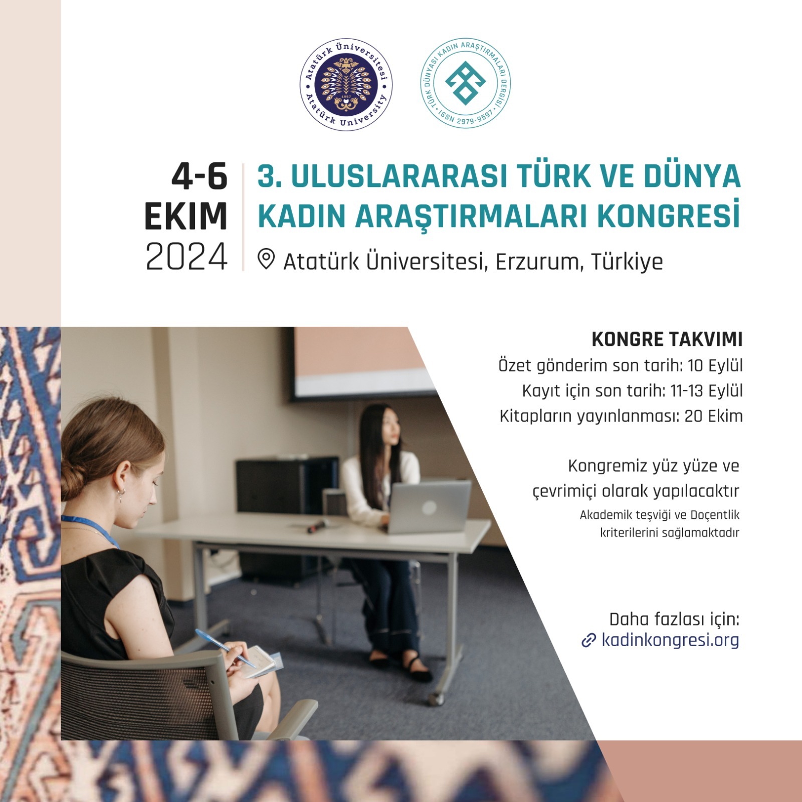 Uluslararası Türk ve Dünya Kadın Araştırmaları Kongresinin birincisi kadim Türk dünyasının manevi ata yurdu olan Türkistan/Kazakistan'da, ikincisi Azerbaycan’da Bakü Kızlar Üniversitesi'nde gerçekleştirilmiştir. “3. Uluslararası Türk ve Dünya Kadın Araştırmaları Kongresi” ise 4-6 Ekim 2024 tarihleri arasında Türkiye’de Atatürk Üniversitesi (Erzurum) ev sahipliğinde gerçekleştirilecektir.